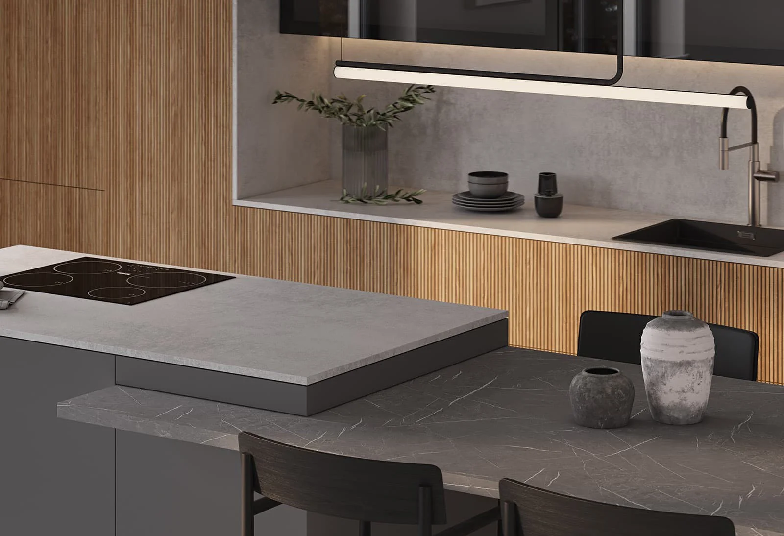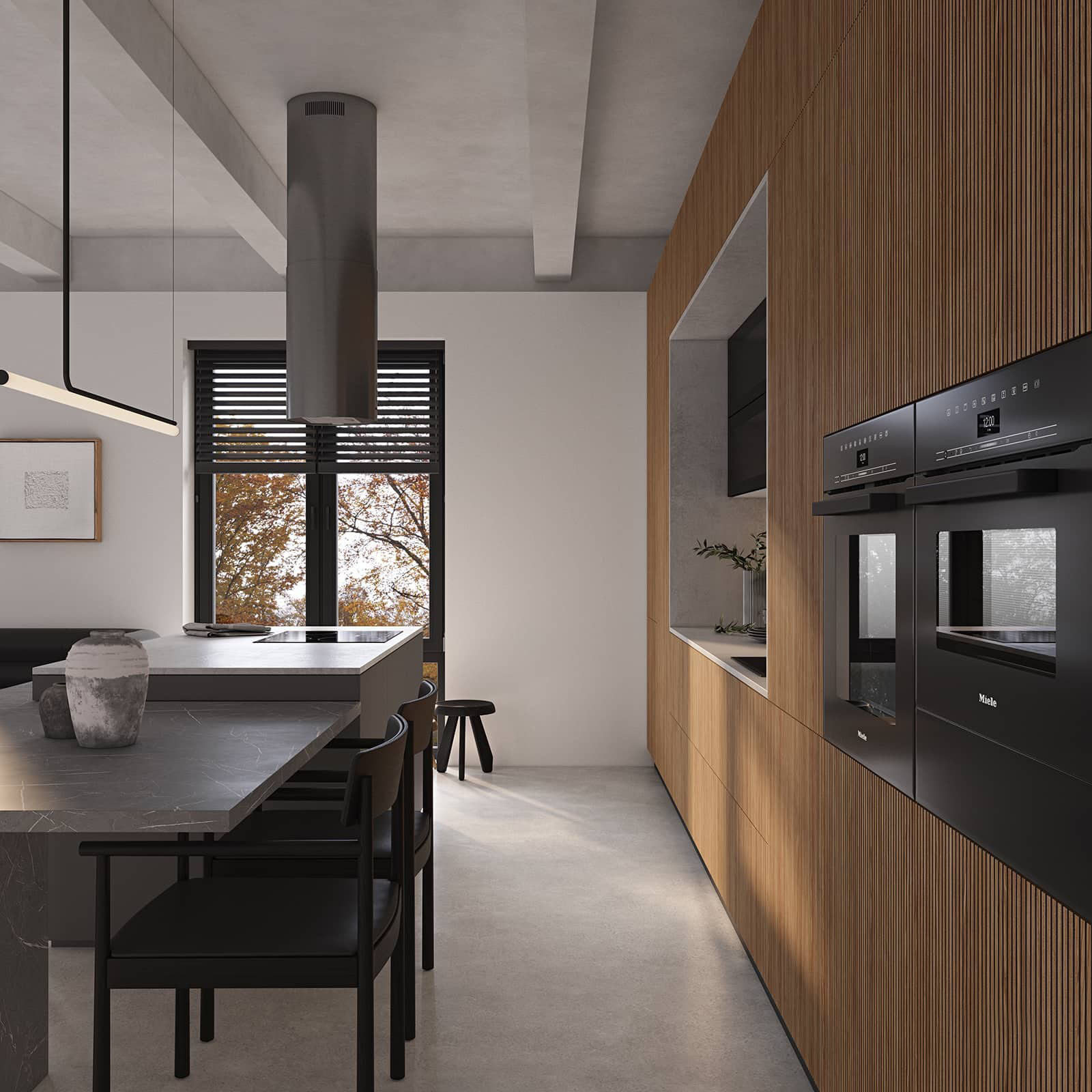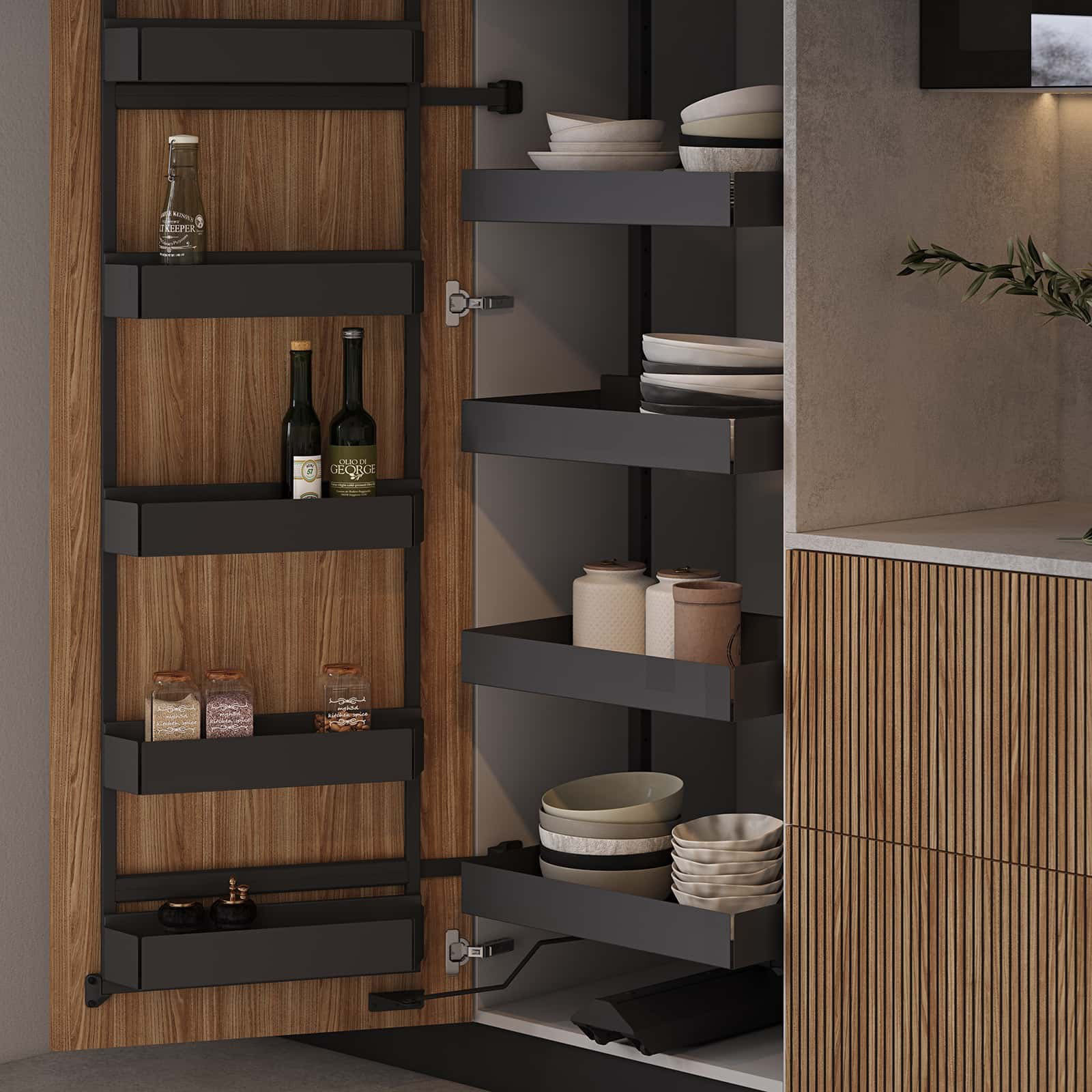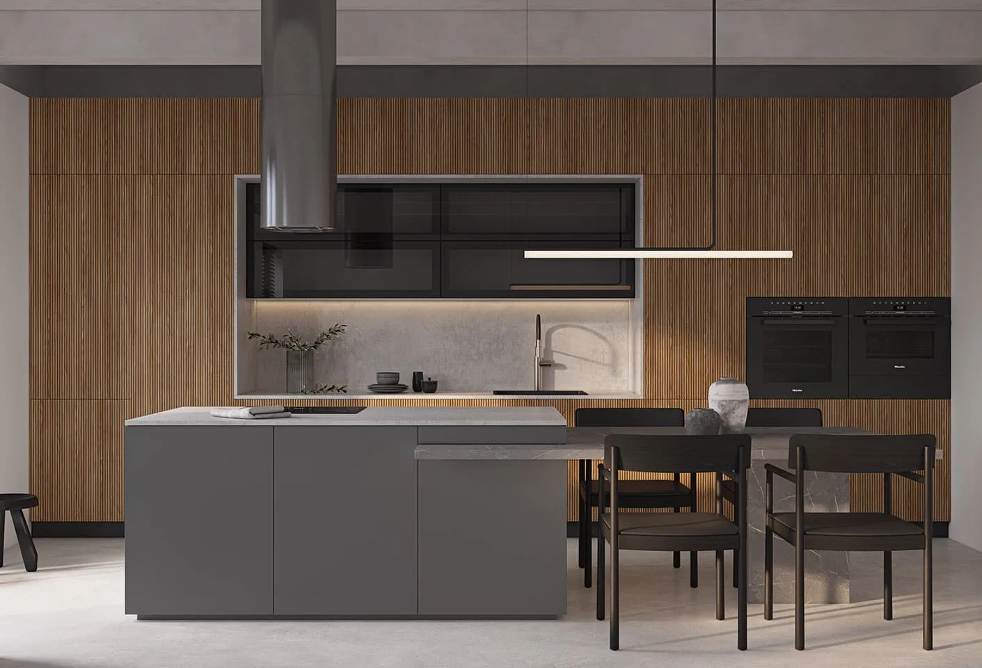 Fronts: T434 Oak wood veneer, color #111 / acrylic Fenix NTM, color Grey-blue NTM (0724)