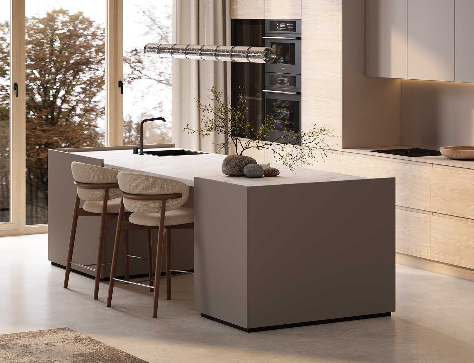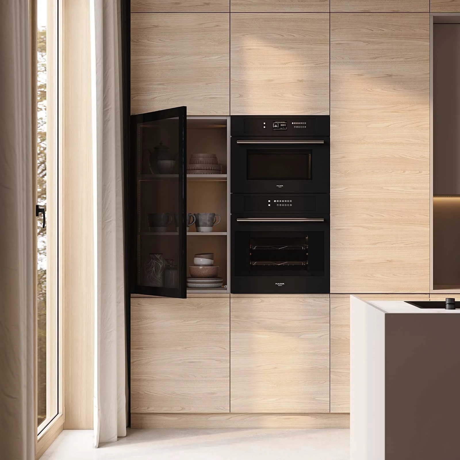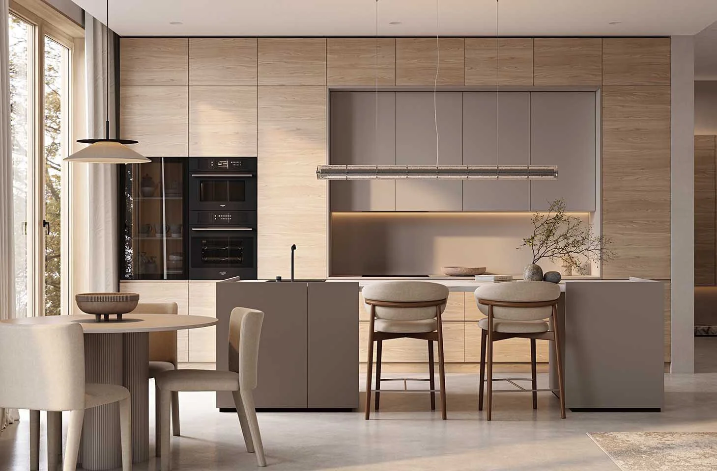 Fronts: acrylic Fenix NTM, color Grey Beige NTM (0748) / T422, T419G Oak wood veneer, color #189 (wax stain White)
