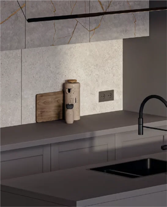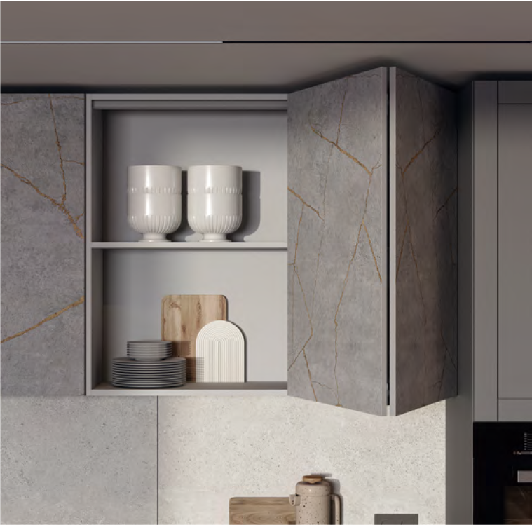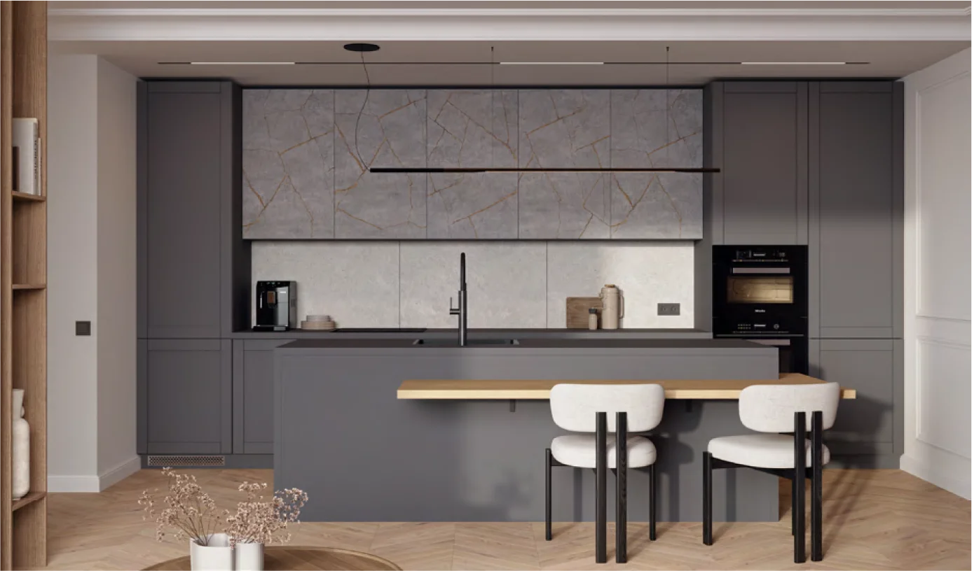Fronts: Trent (MDF / PVC), color NCS S 6502-B; MFC Syncron, design Venato Grey